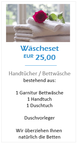 Die aufgeführten Preise sind Endpreise gemäß Preisangabenverordnung (§1). Sie beinhalten alle Nebenkosten (Strom, Gas, Wasser, Heizung, WLAN / Internet Nutzung, Parkplatz vor der Wohnung, usw.) inklusive der Endreinigung, die jeweils in der ersten Übernachtung* enthalten ist! KEINE VERSTECKTEN KOSTEN. Für Kurzzeitvermietung unter 5 Tagen Aufenthalt berechnen wir einen Zuschlag i.H. von 10%. Die Preise gelten für bis zu 2 Personen. Wir berechnen einen Zuschlag von 5€/Tag für die 3. und 4. Person.